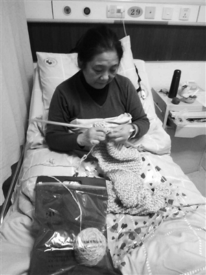 骆阿姨在病床上帮环卫工织围巾 余姚市志愿服务指导中心供图