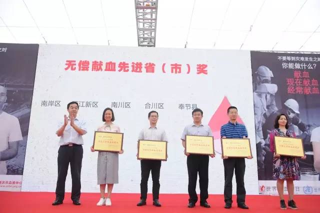 本次重庆地区获无偿献血奉献奖金奖287人,银奖706人,铜奖2538人;无偿献血促进奖10个单位和2名个人;无偿献血志愿服务奖4人;无偿捐献造血干细胞奖10人。南岸区、两江新区、南川区、合川区、奉节县等5个区县获得了无偿献血先进省(市)奖。