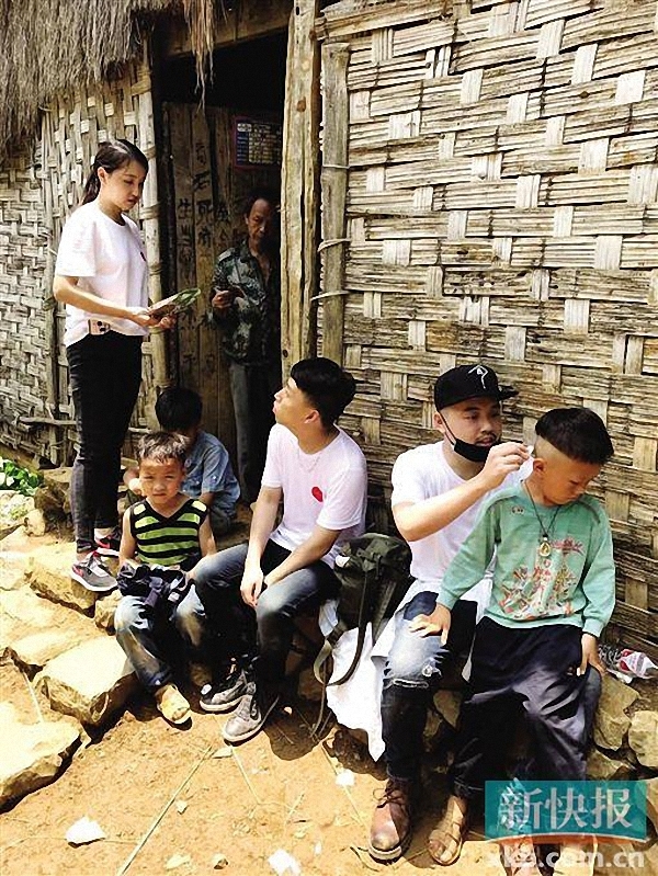 谢奕(右二)为刚理过发的孩子擦去粘在脖子上的碎头发。 新快报 图九年的志愿服务