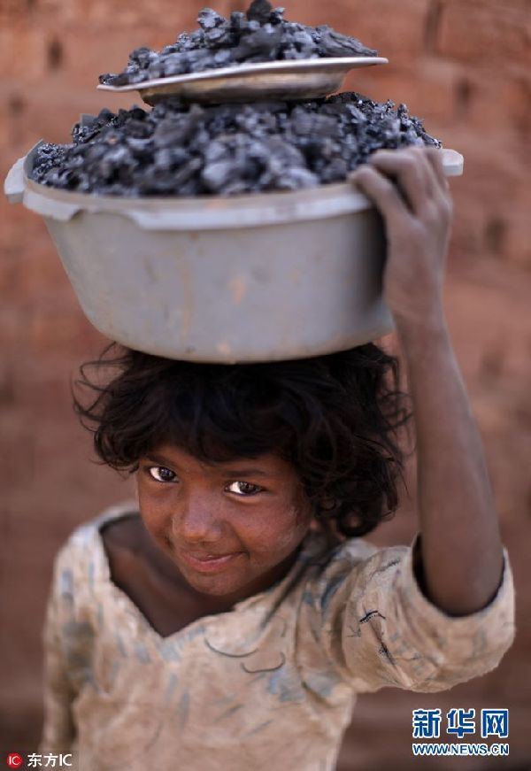 当地时间2012年5月28日,巴基斯坦伊斯兰堡,5岁的Saima Khadim头顶从砖厂捡来的碎煤块。(图片来源:东方IC)
