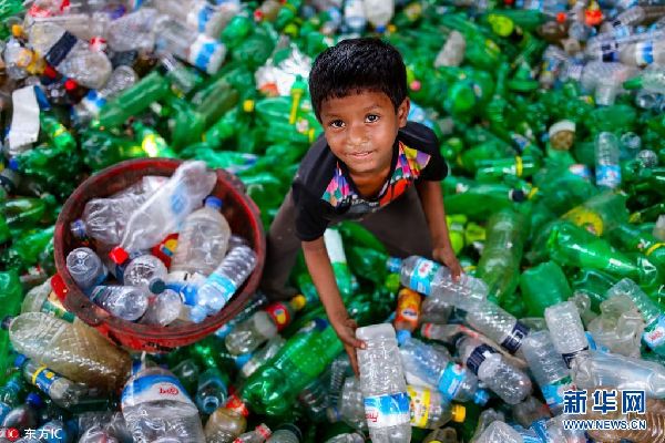 当地时间2016年4月6日,孟加拉达卡,儿童在塑料瓶回收站工作。(图片来源: 东方IC)