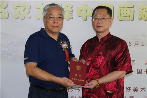 张金卫代表中华慈善总会明天会更好慈善爱心书画艺术交流基金向画家刘峰颁发荣誉慈善证书