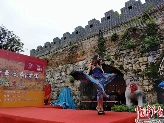 桂林青年在“东西瓦肆”桂林国际青年文创市集上展示原创设计的服装。本次市集以“一带一路”为主题,由团桂林市委主办、桂林手工艺人协会承办。近百名民间手工艺人及高校青年文创团体现场制作富有当地文化内涵的文创产品,向来自世界各地的游客展示和宣传中国文化,搭建起民间文化交流的平台。中国青年报·中青在线记者 谢洋/摄
