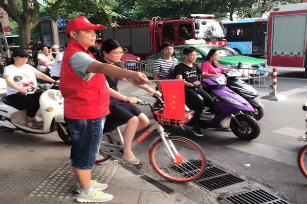 党员志愿者向市民发放《绿色出行,文明出行》倡议书