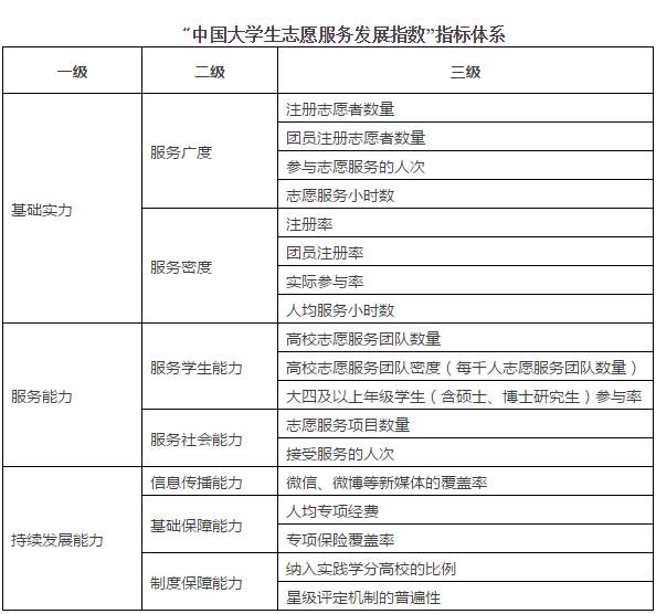 经过对包括国内外大量相关资料的研究学习,特别是国际劳工组织《志愿服务测量指南》(Manual on the measurement of volunteer work)的研究,针对其提出的志愿服务测量的5个核心要素(志愿者的数量、志愿服务小时数、志愿者的服务岗位、志愿者服务的机构、志愿者服务的领域),结合中国高校志愿服务工作实际,特别是高校志愿服务“实践育人”的定位,提出了“中国高校志愿服务发展指数”指标体系,包括3个一级指标、7个二级指标和18个三级指标。分别为: