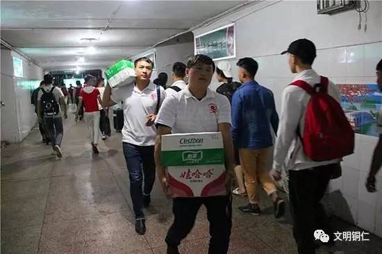 6月25日凌晨,大雨滂沱,渝怀铁路铜仁段内发生水害,部分山体溜塌,途经的多趟旅客列车运行秩序调整,部分乘客滞留。铜仁市阳光志愿者协会通过微信、QQ群组织爱心市民默默集结、有序出发,购买了面包饼干、矿泉水、熟食卤蛋等物品,一箱箱食物搬进了火车站道前,为滞留旅客献上一份爱心,用行动温暖铜仁雨夜。