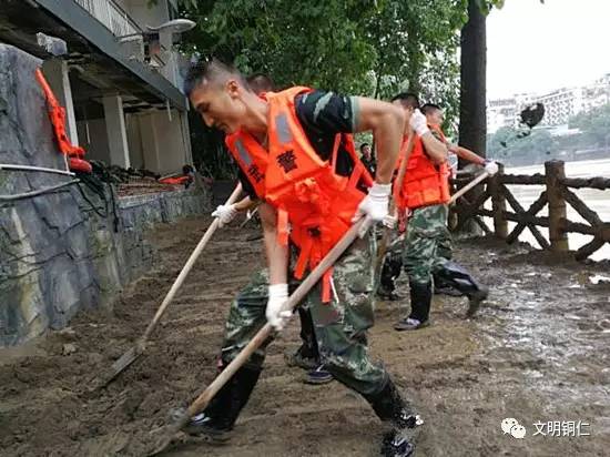 在西门桥下,驻铜官兵们自带工具,分工协作,一铲一铲的将滞留的淤泥铲下河去。虽然灾后的现场淤泥横流、垃圾满地、腥臭不堪,但官兵们毫不在意,卷起裤腿,踏进厚厚的淤泥中,先用铁锹铲掉淤积泥沙,再用高压水枪冲洗,最后用扫帚清扫,衣服早已湿透,头上、脸上、胳膊、衣服、裤子全部溅上污泥,谁也顾不上擦洗,用为人民服务的一份责任心坚守在清淤工作的第一线。