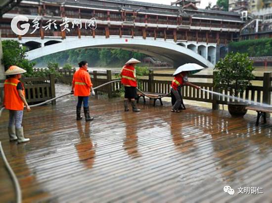 在城区沿江步道,随着河水水位的下降,被洪水淹没了的临江公园广场和沿江步道重见天日,但大量的淤泥和杂物却遗留在平台上,有的地方洪水退去后淤泥厚达近60公分厚。25日凌晨开始,碧江区环卫工人采取“水退我进”的办法,轮流进行清淤。在部分路段,七八个环卫工人扛着消防水泵对沿江步道上无法清扫的淤泥进行冲洗。“从昨天下午三点钟一直持续到今天早上凌晨五点多钟,中间就休息了一个小时,天一亮我们就开始继续清理两岸的河道淤泥,我们尽自己最大的努力把步道清理好、清理干净,还市民一个干净整洁的城市环境。”环卫工人杨平钗说。