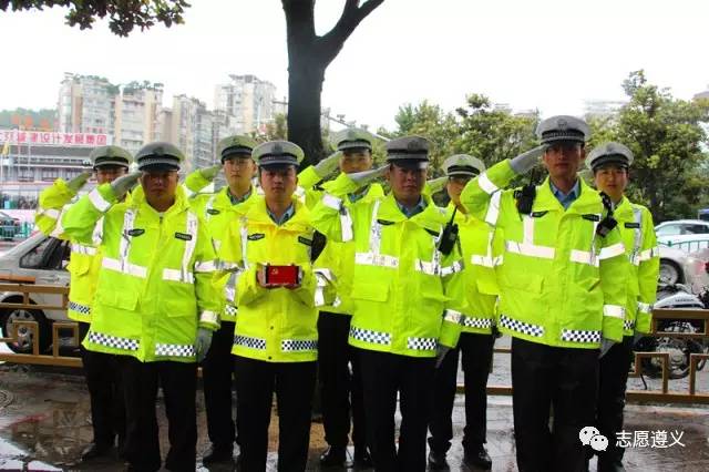 遵义市汇川区交警三中队青年党员赖永生与党旗合影