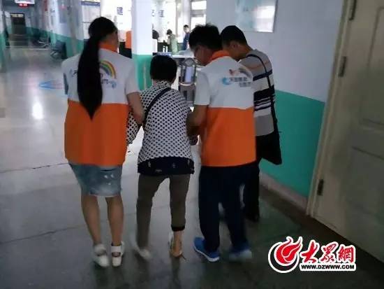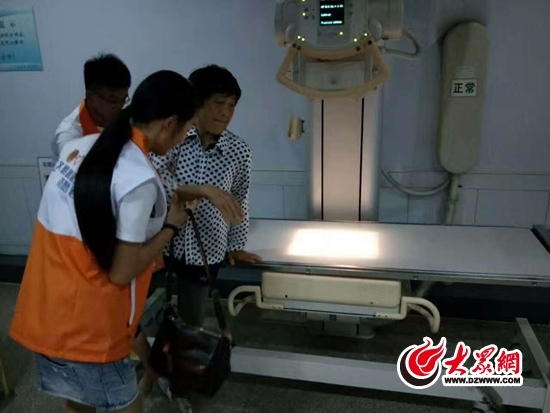 在路上,志愿者了解到老人来自安徽,是自己跟旅游团来日照游玩的。到达港口医院后,志愿者立即给老人办理了挂号,缴费,填写就诊资料等,办理完成后又带领老人到骨科门诊让大夫看看具体情况。大夫观察后说要拍个片子才能具体了解,然后志愿者又搀扶着老人去ct室,因为老人脚踝受伤严重走路很吃力,志愿者看到这种情况立马把老人背起送到ct室,到达ct室,志愿者又把老人搀扶到诊断仪器上,到门口等待。