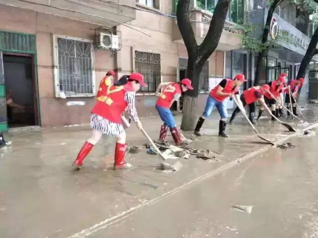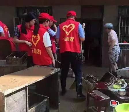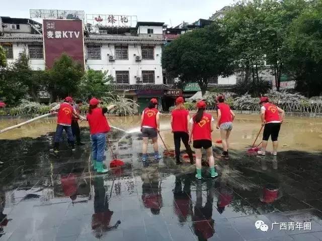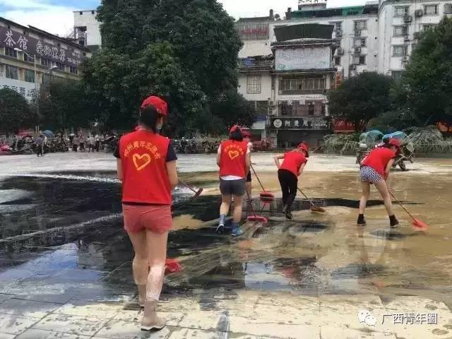 7月2日下午,广西融水团县委在洪水下降的,第一时间组织志愿者来到受灾现场。 志愿者们与干部群众一起除积水、清淤泥。
