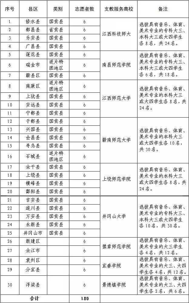 面对如此严峻的形势,江西省委教育工委、省教育厅、团省委等六部门近日联合开展招募高校音体美专业大学生赴边远农村小学开展支教志愿服务的试点,拟从江西师范大学等9所师范类院校音体美专业大学生中选派180名志愿者到我省留守儿童比例高的边远农村小学,从事为期1个学期(半年)的支教志愿服务工作。