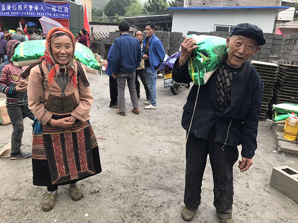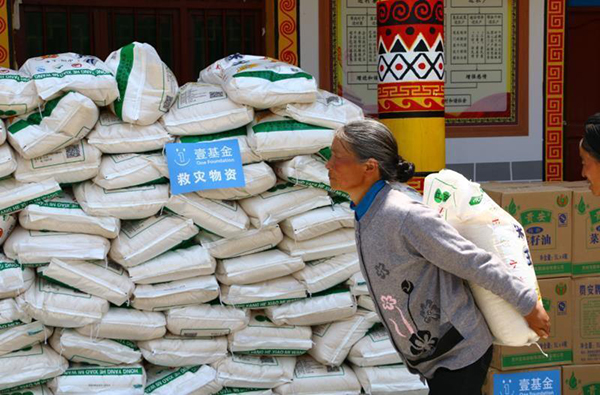 图为壹基金壹家人在贵州瓮安发放救援物资。