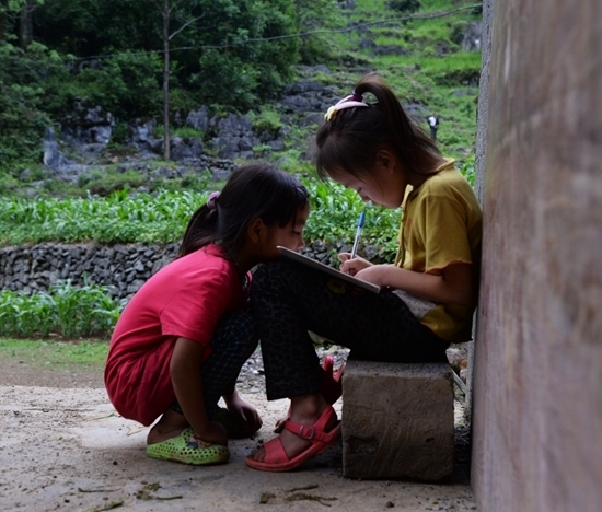 5月28日,广西都安瑶族自治县上镇村保安乡。两个留守儿童姐妹在互相学歌,抄歌词。她们很喜欢音乐,长大后想成为歌唱家。视觉中国供图