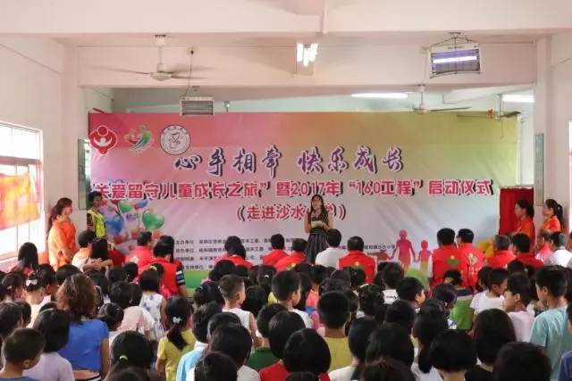 心手相牵快乐成长——“关爱留守儿童成长之旅”暨2017年“160工程”启动仪式7月7日下午在杨和镇沙水小学成功举办,也表示高明区首个“留守儿童”关爱基地创建成功。本次活动,为200多名留守儿童派发了成长礼品和书籍,并为44名特别困难的留守儿童建立了成长档案,同时也为孩子们带来了精彩的醒狮表演和舞蹈表演。