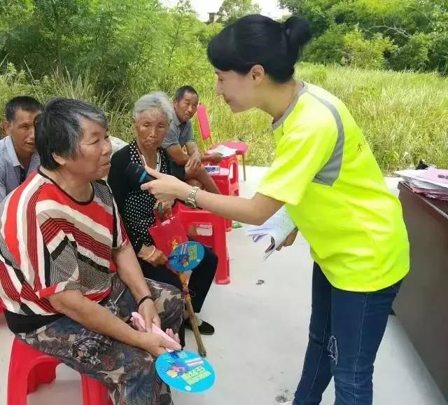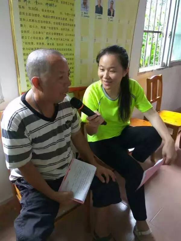 志愿者蔡惠蓉耐心为一位老奶奶讲解政策,一遍又一遍,豪无厌色,努力打开腼腆群众的心声,和每一位群众融合相处。
