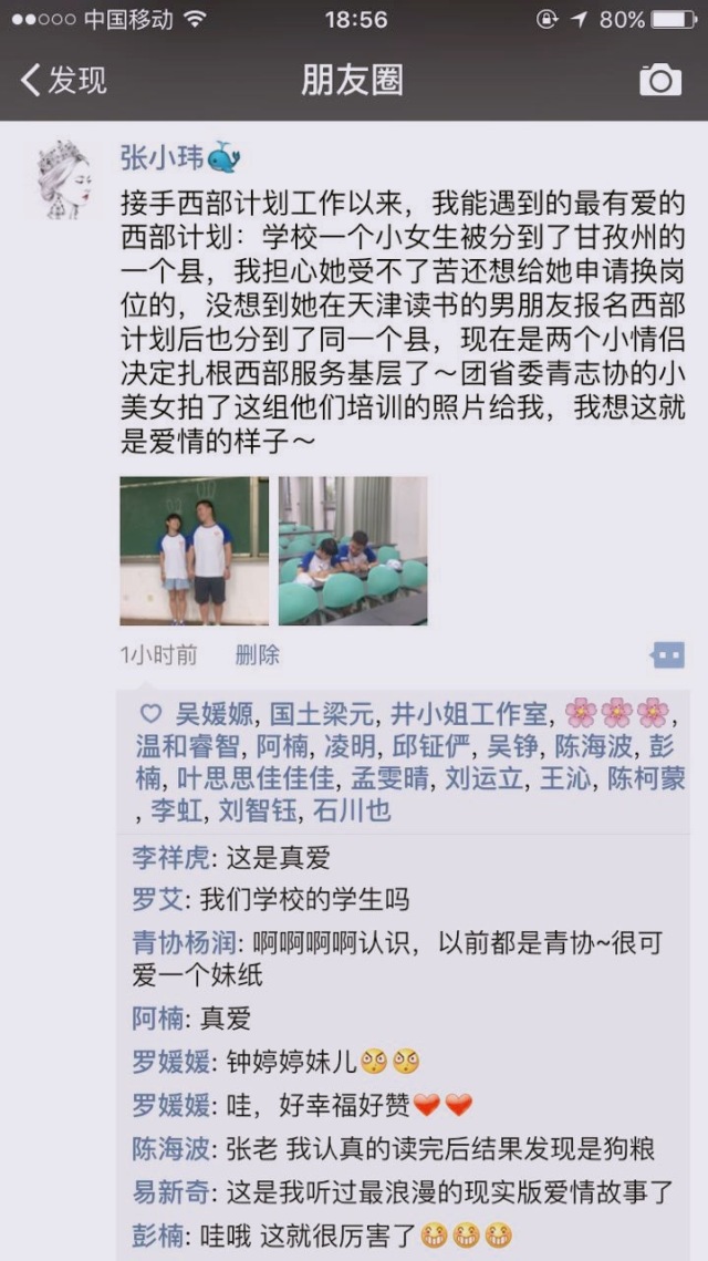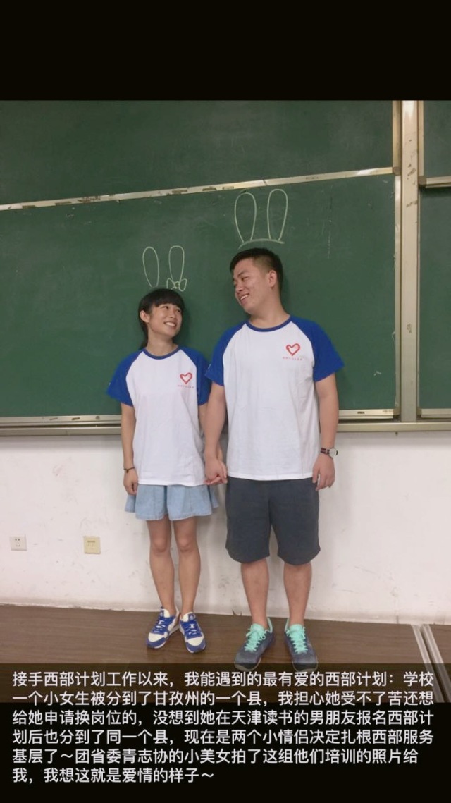 天津距成都约1817公里,但他们刚好避开异地的烦恼。大四才相遇是相见恨晚,但更是恰如其分。一切都被安排好,今年正好是四川恢复在外省招募志愿者的一年,而甘罗正好是自己学校唯一一个到四川服务的志愿者;服务地结果出来前一晚,他们彻夜难眠,想尽了一切最糟的情况,只有甘罗一直说,我们一定会分在一起。第二天,果然。这样的曲折回环,显得一见钟情只是这段感情的小小点缀。