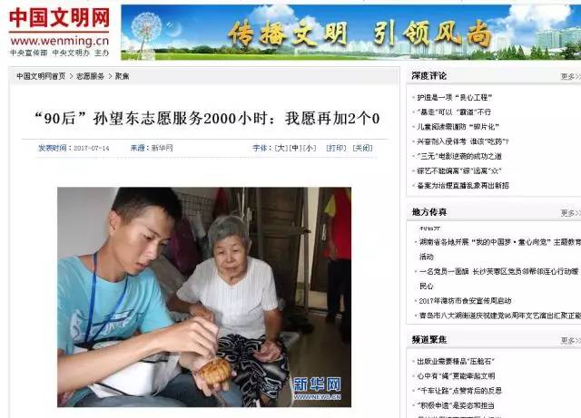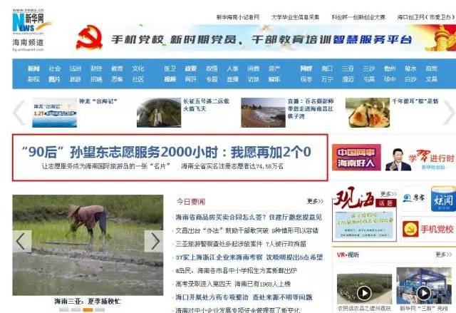 7月14日,新华网以《“90后”孙望东志愿服务2000小时:我愿再加2个0》为题报道了海口“90后”青年志愿者孙望东的公益故事,点赞海口市志愿服务工作。该报道在新华网首页以及新华网海南频道首页大头条展示,同时被中国文明网转载。