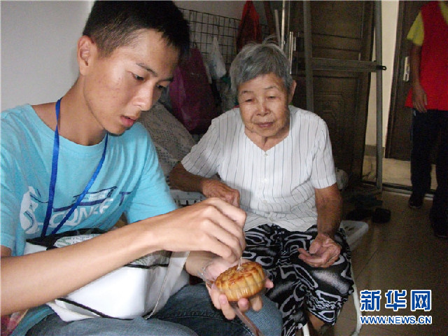 △中秋时节,孙望东带着月饼上门慰问孤寡老人。新华网发