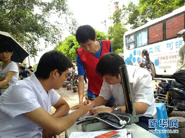 △孙望东(中)在进行无偿献血宣传和造血干细胞动员。新华网发