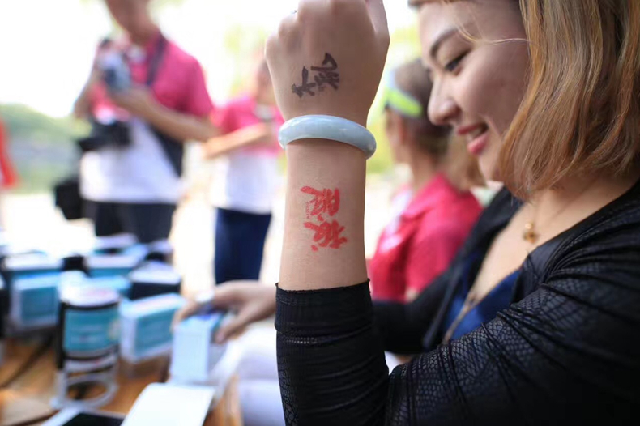 市民将喜欢的印章盖到手上。图片来源:济南市旅发委