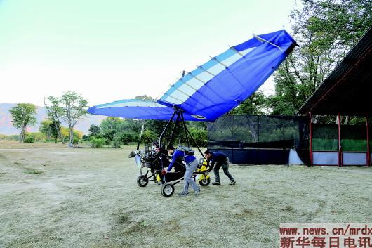 6月15日,中国志愿者和马纳普斯国家公园园长阿亮将动力三角翼推出机库。