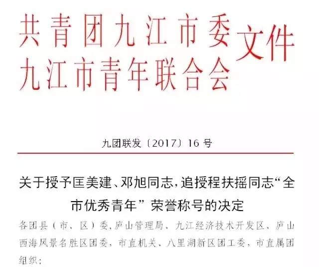 匡美建、邓旭、程扶摇同志是新时期青年的楷模,是在党的培养下成长起来的优秀青年代表,是群众心目中抗洪抢险的英雄,是全市广大团员青年学习的榜样。根据他们的一贯表现和在这次抗洪抢险工作中的突出表现,九江团市委、九江市青联研究决定,授予匡美建、邓旭同志“全市优秀青年”称号,追授程扶摇同志“全市优秀青年”称号。