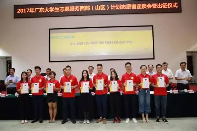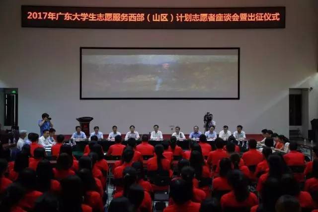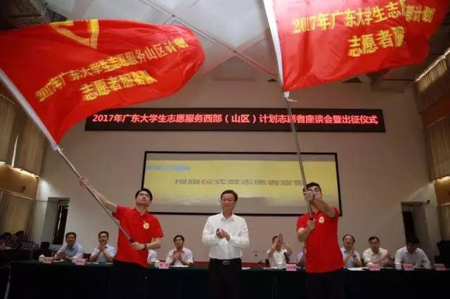 2017年7月20日上午,由团省委、省教育厅、省财政厅、省人力资源和社会保障厅等单位共同主办的2017年广东大学生志愿服务西部(山区)计划志愿者座谈会暨出征仪式在广东青年职业学院举行。省委常委、组织部部长邹铭,团省委书记池志雄和主承办单位领导出席活动并与志愿者合影。