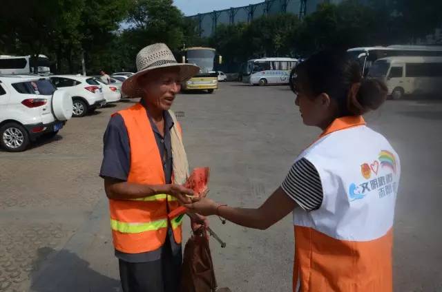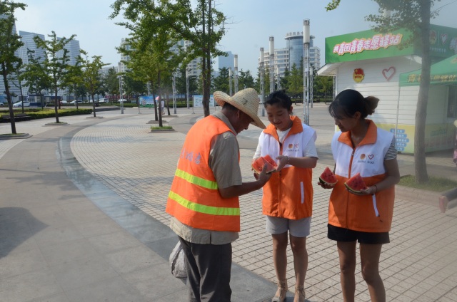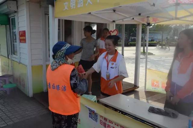 下午,灯塔广场青年志愿者自费购买西瓜 为景区环卫工人、保安人员送去一份清凉。