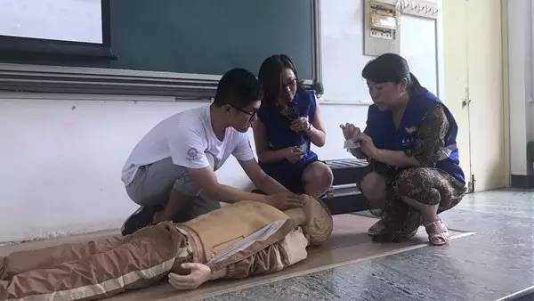 在通过理论学习后,大家进行了教学互动,向日葵志愿服务中心负责人、威海市中心医院主治医师郑君涛和中心成员、市立医院主治医师赵洪晓、经区医院主治医师王晓辉、中心医院主治医师何晓琳利用道具假人分组指导学生们进行了心肺复苏的现场演练与实际操作。