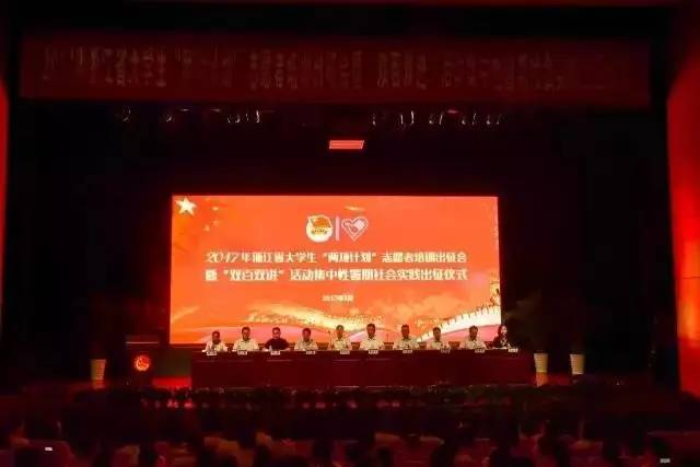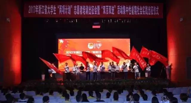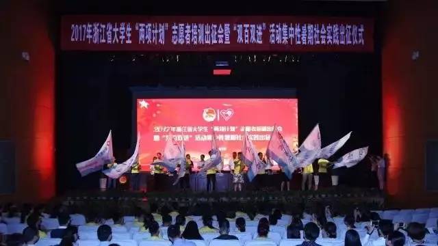 7月4日,2017年浙江省大学生“两项计划”(即浙江省大学生志愿服务西部计划和山区、海岛、边远地区计划)志愿者培训出征会在浙江农林大学活动中心举行。自2003年以来,浙江省“两项计划”志愿服务行动已累计选派了3839名“两项计划”大学生志愿者到新疆、西藏、四川等西部地区和省内山区、海岛、边远地区,从事支医、支教、支农和精准扶贫等志愿服务工作。
