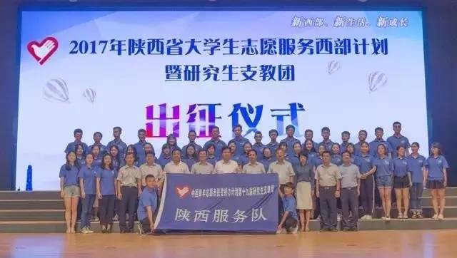 7月26日,陕西省大学生志愿服务西部计划暨研究生支教团出征仪式在西京学院隆重举行。截至2016年,陕西省已为西藏和新疆地区累计选派了830名志愿者,为新疆和西藏的稳定发展做出了积极的贡献,得到了当地人民的欢迎和肯定。日前,由团省委组织招募的121名援疆(兵团)、援藏大学生志愿者已抵达阿里、若羌、阿勒泰、石河子等服务地。