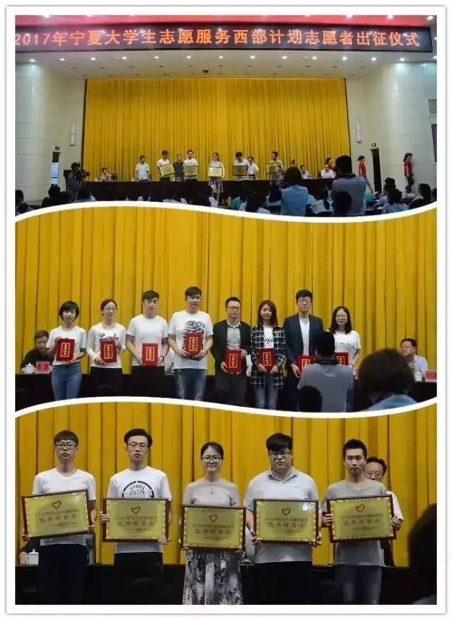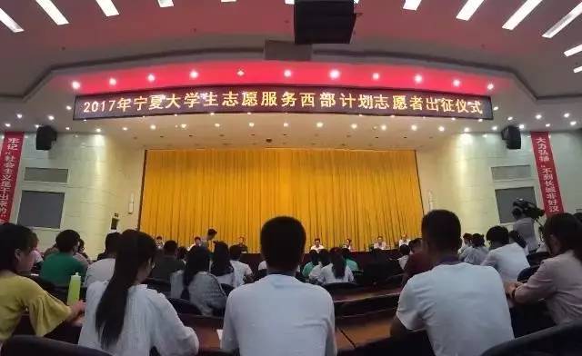 7月27日,2017年度宁夏大学生志愿服务西部计划志愿者出征仪式在银川隆重举行。仪式上,对160名2016-2017年度宁夏大学生志愿服务西部计划优秀志愿者、5个优秀项目办进行了表彰。对新招募的481名西部计划志愿者,宁夏自治区将重点向脱贫攻坚第一线倾斜,为9个国定贫困县每个乡镇、街道将至少配备一名志愿者。