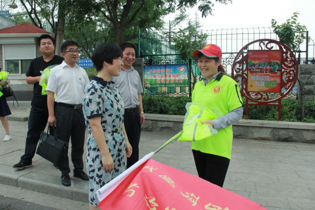 团市委书记孟云霞为志愿者送来防晒服