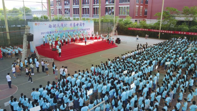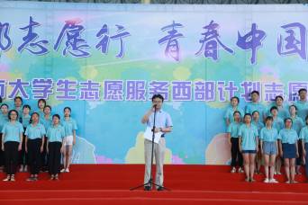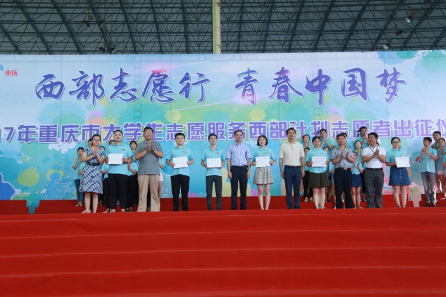 重庆市组织部、人力社保局、扶贫办、团校等10余家市级单位及山东团省委、外交学院团委等有关领导向2016-2017年度优秀志愿者颁发了荣誉证书,并为研究生支教团重庆志愿服务队、“山茶花”脱贫攻坚青年志愿者突击队、山东省扶贫协作重庆专项志愿服务队和其他西部计划志愿者代表队授旗、送行。