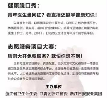 改变理念,志愿服务除了提供服务、给人方便以外,更重要的是挖掘和体现服务者的价值,通过志愿服务使志愿者的专业价值和技术能力得到提升,从而激发和坚定志愿者的志愿服务意愿是更高层次的志愿服务理念。本次系列志愿活动的一大创新——“健康脱口秀”,项目以大卫生大健康为背景,将传统的科普讲座演绎为轻松活泼的脱口秀。通过热门的网络直播的方式,结合场景化的现场秀,同时推出直播互动,在直播期间网友还能向医师们提问并得到实时解答。不仅向百姓传播宣讲健康保健和医学常识,更是检验和提高青年医师业务能力和沟通水平,培养具有“网红”气质的青年专家,打造卫生计生青年成长成才的新平台。活动一经推出,引发系统青年极高的参与热情。