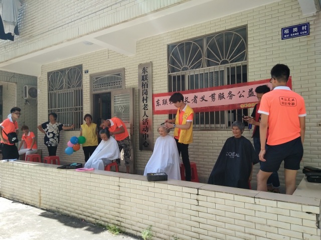 7月20日下午,惠州大亚湾区民政局购买社工服务东联社区综合服务中心为社区长者筹办“东联社区长者义剪服务公益活动”。经东联社区综合服务中心的邀请,丹丹美容美发学校15名志愿者来到东联柏岗村老人活动中心、社背村老人活动中心、新溪村1队和3队老人活动中心及东联市场农商银行对面,为社区长者及居民提供义剪服务。