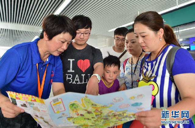 8月3日,厦门晨曦公益服务队队员刘鸿雁(左一)在厦门火车站出站口向游客介绍厦门主要旅游景点。