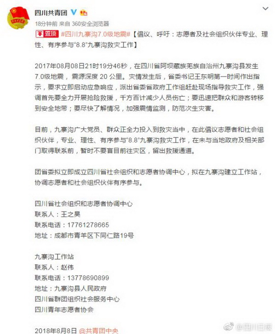 目前,九寨沟地震灾区的广大党员、群众正全力投入到救灾当中,共青团四川省委呼吁,志愿者和社会组织伙伴要专业、理性、有序参与“8·8”九寨沟救灾工作,在未与当地政府及相关部门取得联系前,暂时不要盲目前往灾区,留出救援通道。