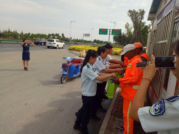 为环卫工人送去防暑物品 图片来源:九原区执法分局