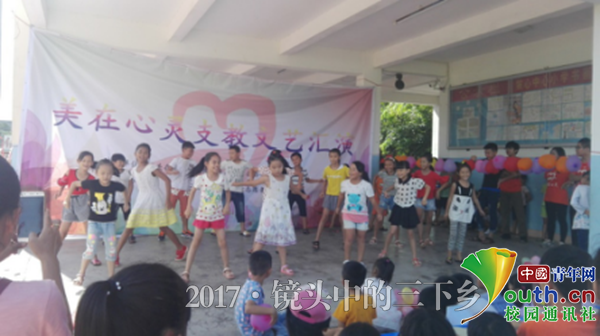 支教的最后一天,志愿者们早早起来布置会场,整齐的桌椅,五彩斑斓的气球,一切都在为文艺汇演做准备。孩子们用自己在这些日子里学到东西展现给大家。小小场地聚集了大小朋友们,家长看着自己孩子的精彩演出而奋力鼓掌。