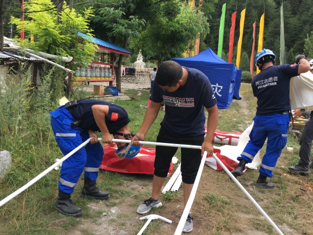 为受灾老百姓搭建帐篷。