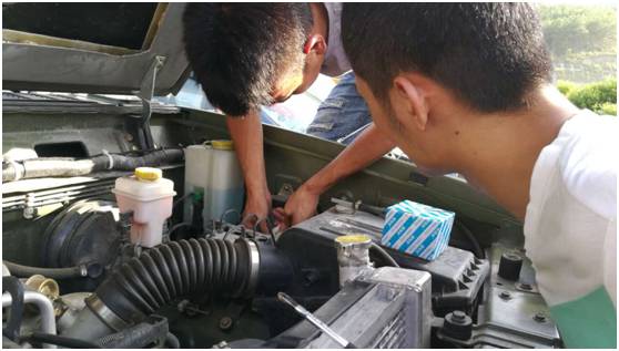 图为志愿者在途中对车辆进行整修。