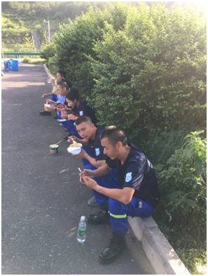 志愿者们在路边以泡面充饥。