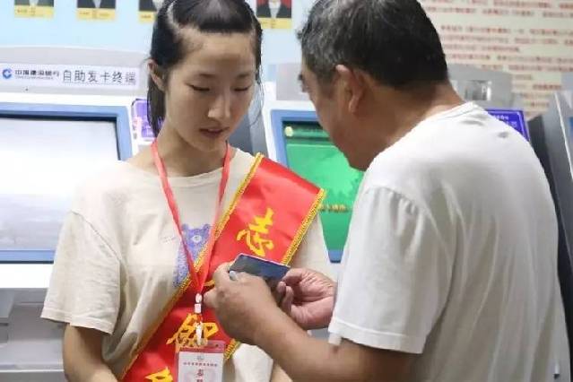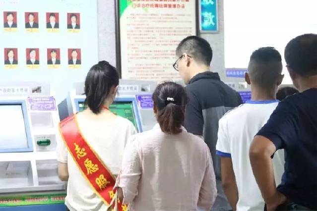 小小的挂号机前排起了队伍,志愿者从容应对指导叔叔阿姨们使用新型机器,方便患者挂号排队。