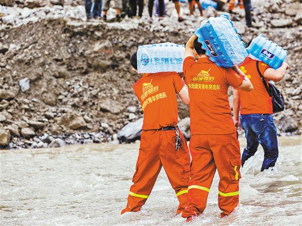 ▲突击队队员正在搬运救灾物资。