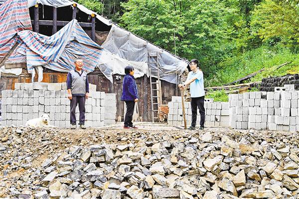 8月11日,刘峻潇帮助周溪乡凉风村村民陈龙刚(上)夫妇背运盖房用的瓦片。