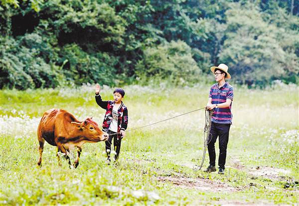 8月11日,刘峻潇在周溪乡凉风村和10岁的王霖枫一起放牛。