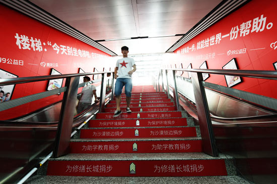 近日,杭州一地铁站多了一道特别的“爱心台阶”。该楼梯上下两端分别设置了红外感应器,当乘客走完这59级台阶时,旁边的大屏幕会记下步数,并将这步数转化为公益事业的捐款,因此吸引了不少杭州市民和游客前来走过“爱心台阶”。