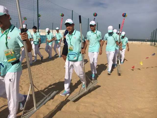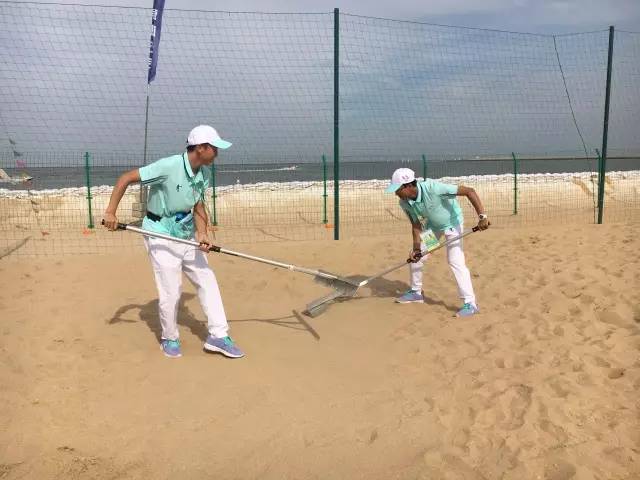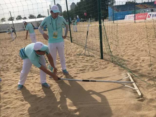 天津科技大学的志愿者们在清理沙滩排球比赛场地,烈日当空,志愿者们依旧进行着自己的工作。美丽的小姐姐也被晒黑了,但是自信灿烂的笑容依旧是她美丽的资本!